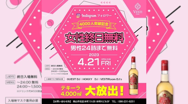 【VESTI Room:金曜日】今夜は最高に盛り上がる選曲で最高に楽しめる夜をお届けするPARTY開催★岡山最高クラスのミュージックスペース!人気クラブで楽しもう!クーポン利用でお得!